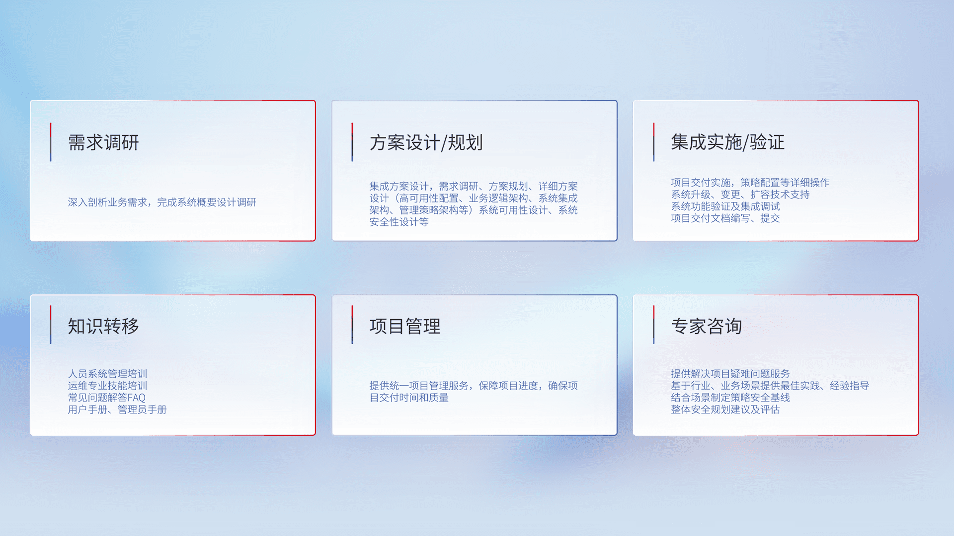 针对客户行业特性,,,将宏观的安全战略和需求,,通过专业的交付服务,,实现项目落地,,,为客户提供标准规范的集成交付服务。。。。